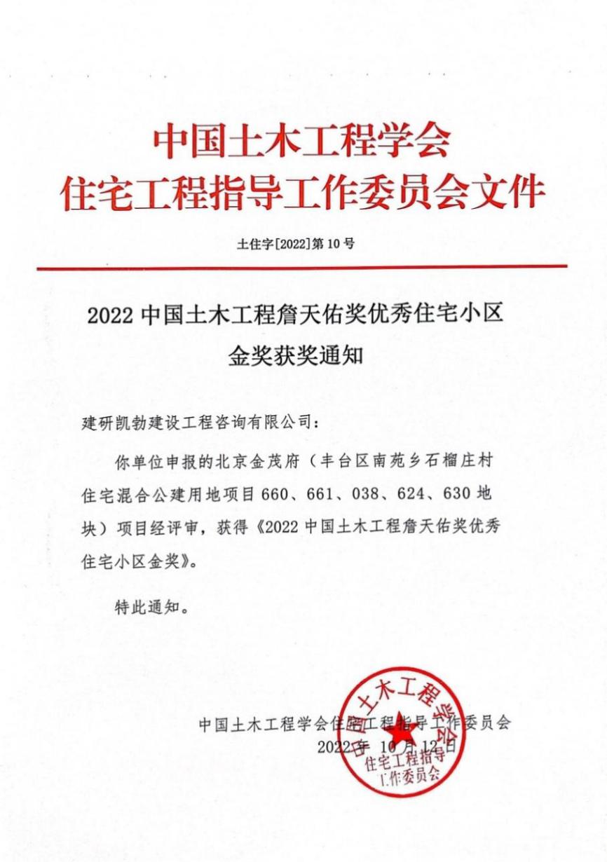 近日,中國土木工程學會住宅工程指導工作委員會公布了“2022中國土木工程詹天佑獎優(yōu)秀住宅小區(qū)金獎”評選結果,建研凱勃公司監(jiān)理的“北京金茂府(豐臺區(qū)南苑鄉(xiāng)石榴莊村住宅混合公建用地項目660、661、038、624、630地塊)”工程榮獲“2022中國土木工程詹天佑獎優(yōu)秀住宅小區(qū)金獎”。
