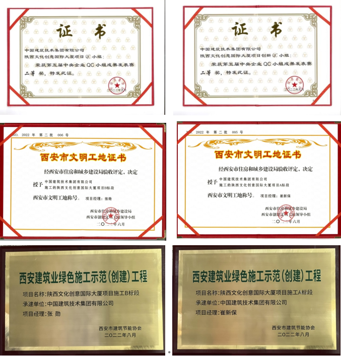 此前,陜西文化創(chuàng)意國際大廈項目QC小組曾在第四屆中央企業(yè)QC小組成果發(fā)表賽中榮獲三等獎。兩年間,小組成員共計完成4項課題,并在西安市發(fā)表賽中斬獲一等獎3項、二等獎1項。在QC小組驅(qū)動下,文創(chuàng)項目也積極評優(yōu),相繼榮獲“西安市文明工地”“西安建筑業(yè)綠色施工示范工程”等多項獎項。