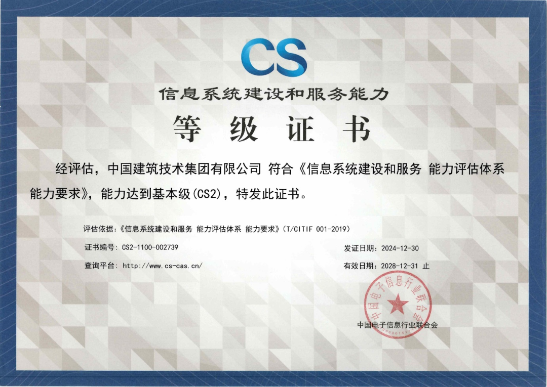 近日,中國建技成功通過中國電子信息行業(yè)聯(lián)合會評審,榮獲CS2信息系統(tǒng)建設(shè)和服務(wù)能力認(rèn)證。這是中國建技繼質(zhì)量、環(huán)境、職業(yè)健康安全、信息技術(shù)服務(wù)、信息安全管理體系認(rèn)證后,獲得的又一項國家級權(quán)威認(rèn)證。