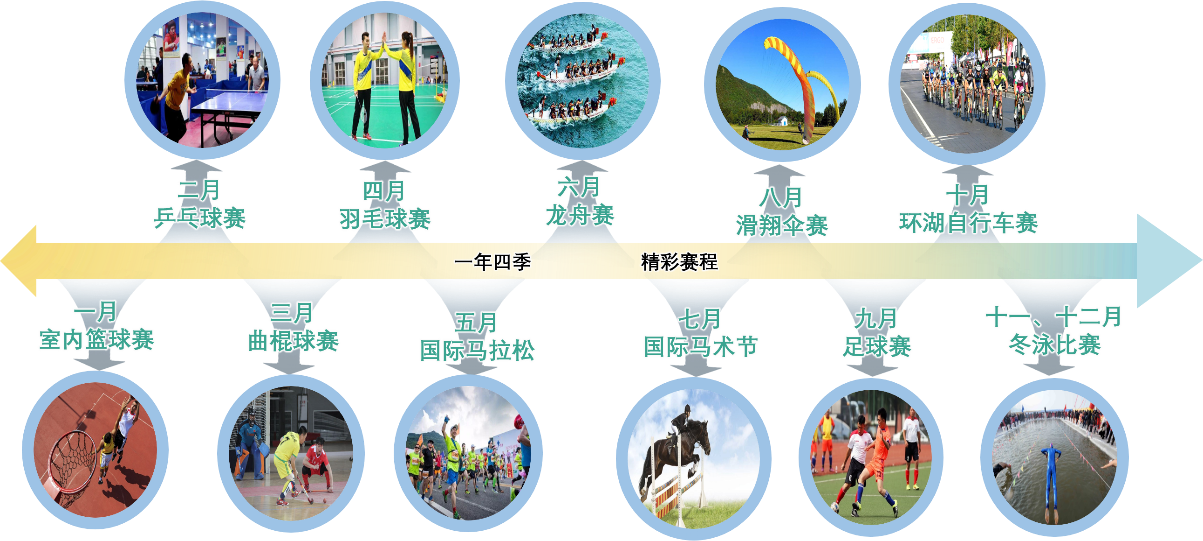 2.4.運(yùn)動賽事:結(jié)合國家加快發(fā)展健身休閑產(chǎn)業(yè)的指導(dǎo)意見、體育運(yùn)動名錄及小鎮(zhèn)建設(shè),打造灰湯體育小鎮(zhèn),布局如足球、馬術(shù)、自行車(東鶩山環(huán)道及環(huán)湖自行車道)、環(huán)湖田徑馬拉松、游泳、賽艇、龍舟賽、擊劍、射箭、射擊(室內(nèi))、太極、廣場舞、攀巖、競走等運(yùn)動項目,結(jié)合各已開發(fā)項目布置全民休閑運(yùn)動項目,打造湖南省賽事運(yùn)動基地。