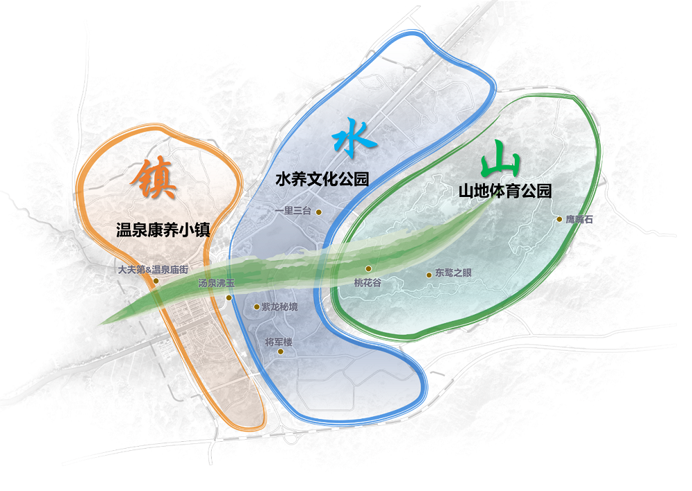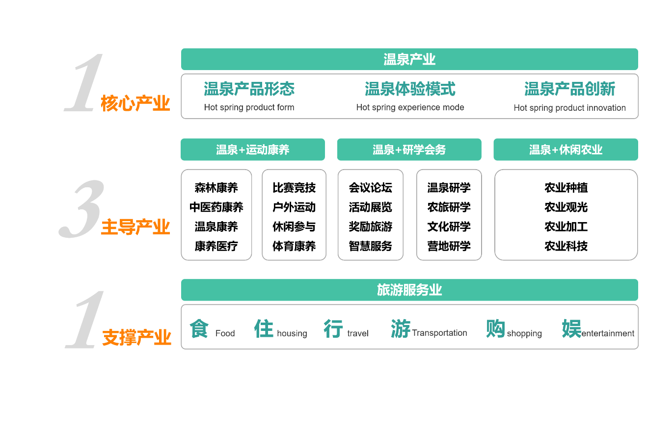 以“溫泉”為核心,以“溫泉+運(yùn)動康養(yǎng)”、“溫泉+研學(xué)會務(wù)”、“溫泉+休閑農(nóng)業(yè)”為三大主導(dǎo)產(chǎn)業(yè)以旅游服務(wù)業(yè)為支撐,構(gòu)建“1+3+1”的產(chǎn)業(yè)體系。