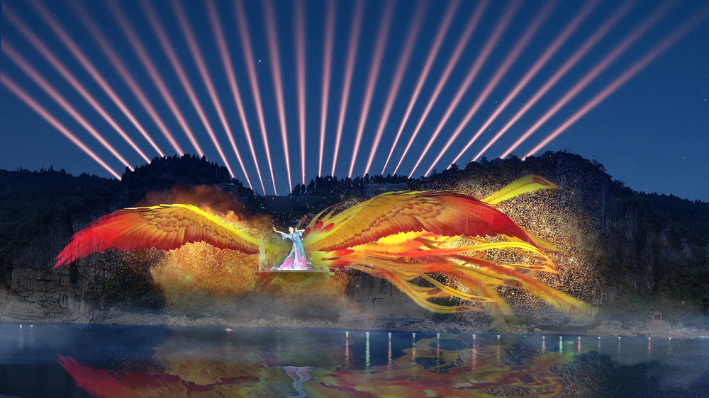 崖壁5D燈光秀尤為新穎,采用“崖壁投影+舞臺(tái)演繹”的方式,以兩側(cè)崖壁為投影載體,中間布置小舞臺(tái)配合燈光矩陣,將辛女與盤瓠的凄美愛(ài)情故事和妖怪來(lái)襲國(guó)破山河場(chǎng)面,將軍點(diǎn)兵出征的戲劇場(chǎng)面演繹得活靈活現(xiàn)。